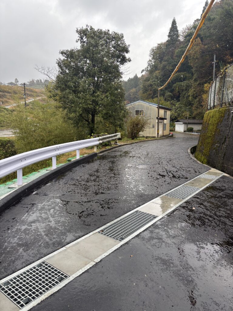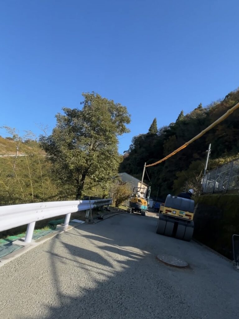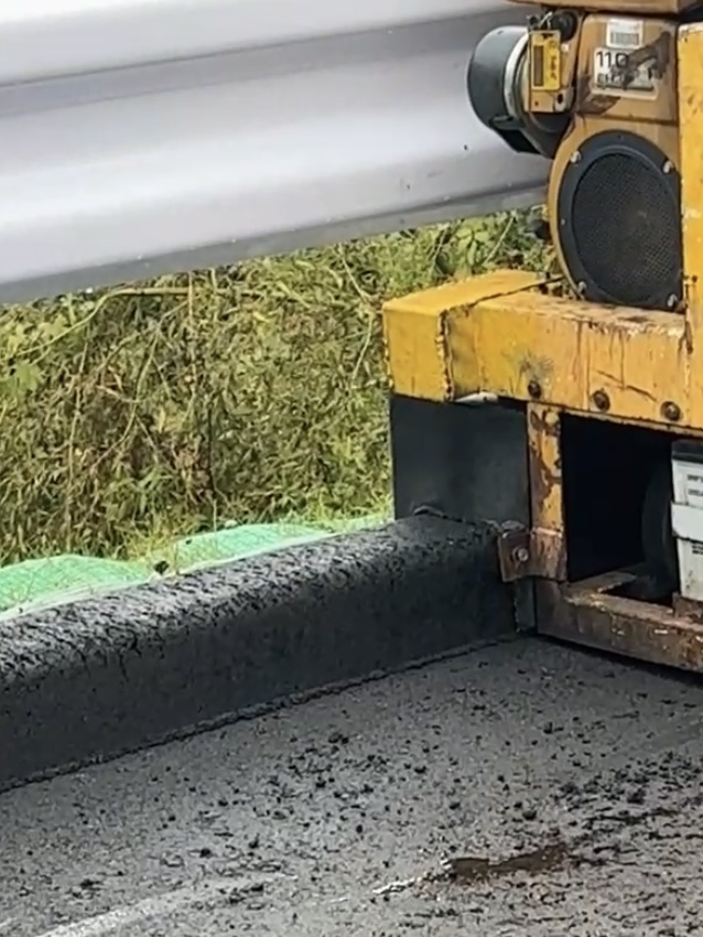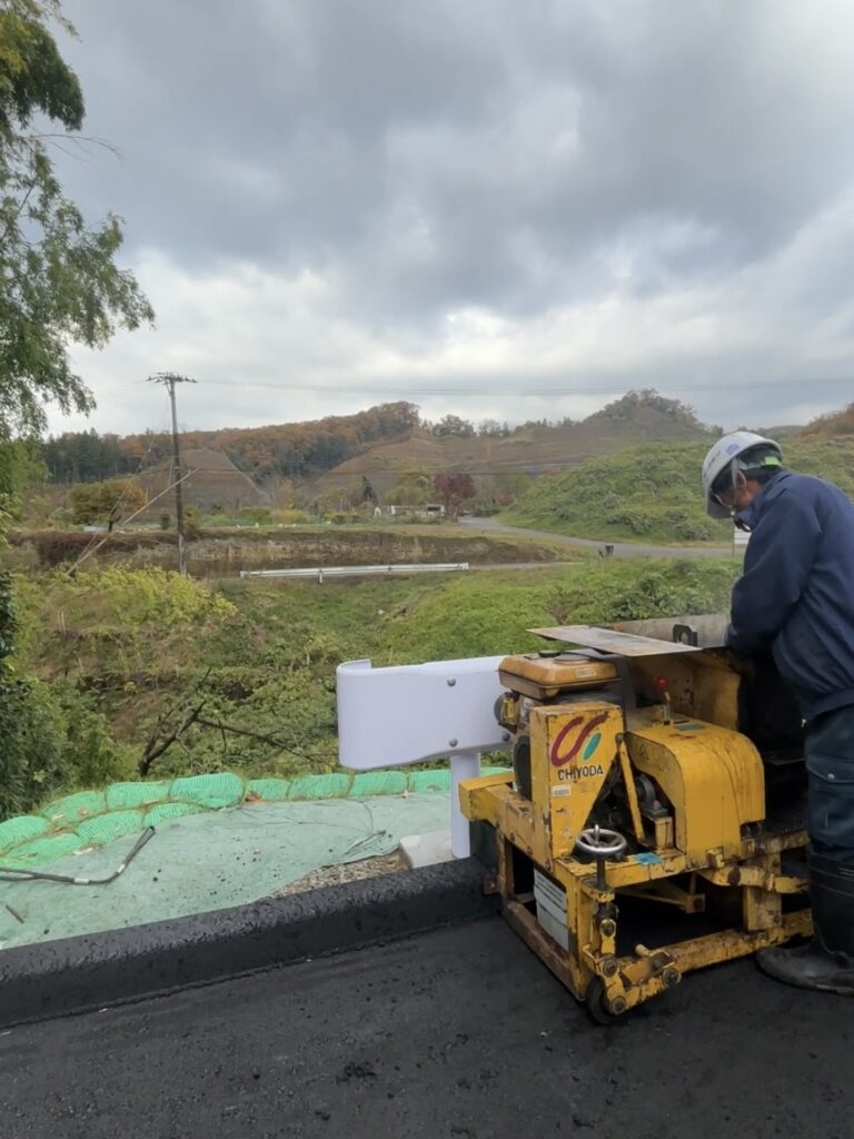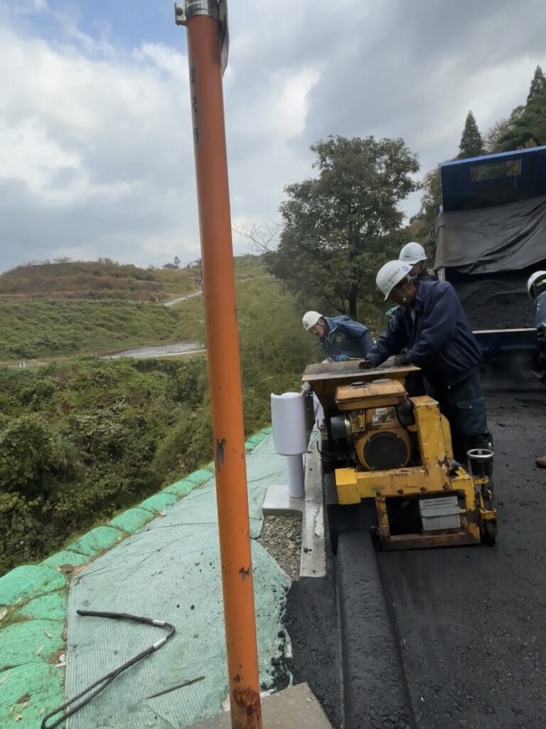 また、施工区間内におそらく大雨で崩れてしまった箇所の復旧工事に伴うアスカーブの設置も行いました。アスカーブはアスカーバーと呼ばれる機械で施工します。上から材料を投入し台形につながった状態で押し出しながら進んでいきます。アスカーブの役割は、道路の表面を流れてきた雨水がのり面に流入しないように排水施設まで誘導することです。雨水がのり面に流入すると表面を水の流れが削っていき、大きな崩れにつながります。